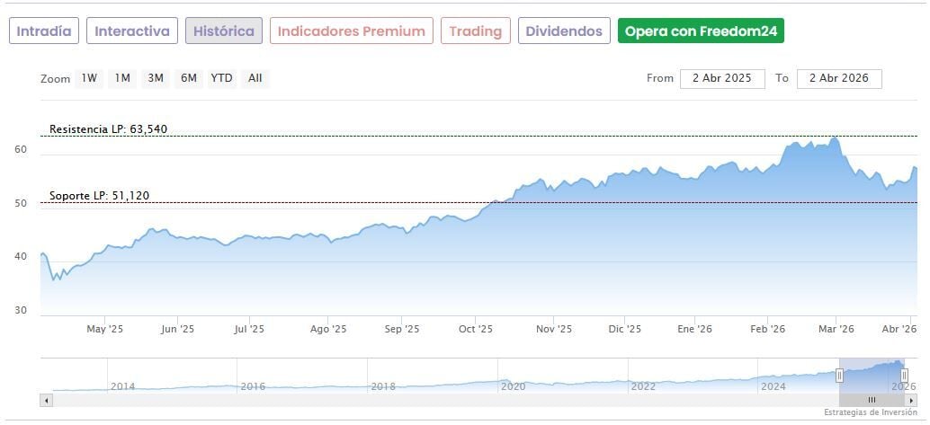 Las acciones han corregido casi un 10% desde los máximos que tocaron el 27 de febrero en 63,54 euros, pero todavía acumulan una subida de un 3,43% en lo que va de año. Además, suben un 60% desde los mínimos de abril del año pasado en 35,78 euros.