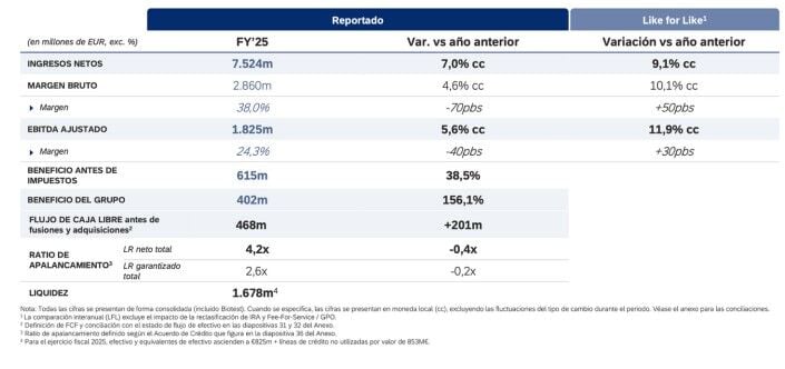 El flujo de caja libre antes de fusiones y adquisiciones ascendió a 468 millones de euros, 201 millones más que en 2024, gracias a la expansión del EBITDA, la gestión del capital circulante, la reducción de los costes financieros y la normalización del Capex, reflejando mejoras estructurales en la generación de caja.
