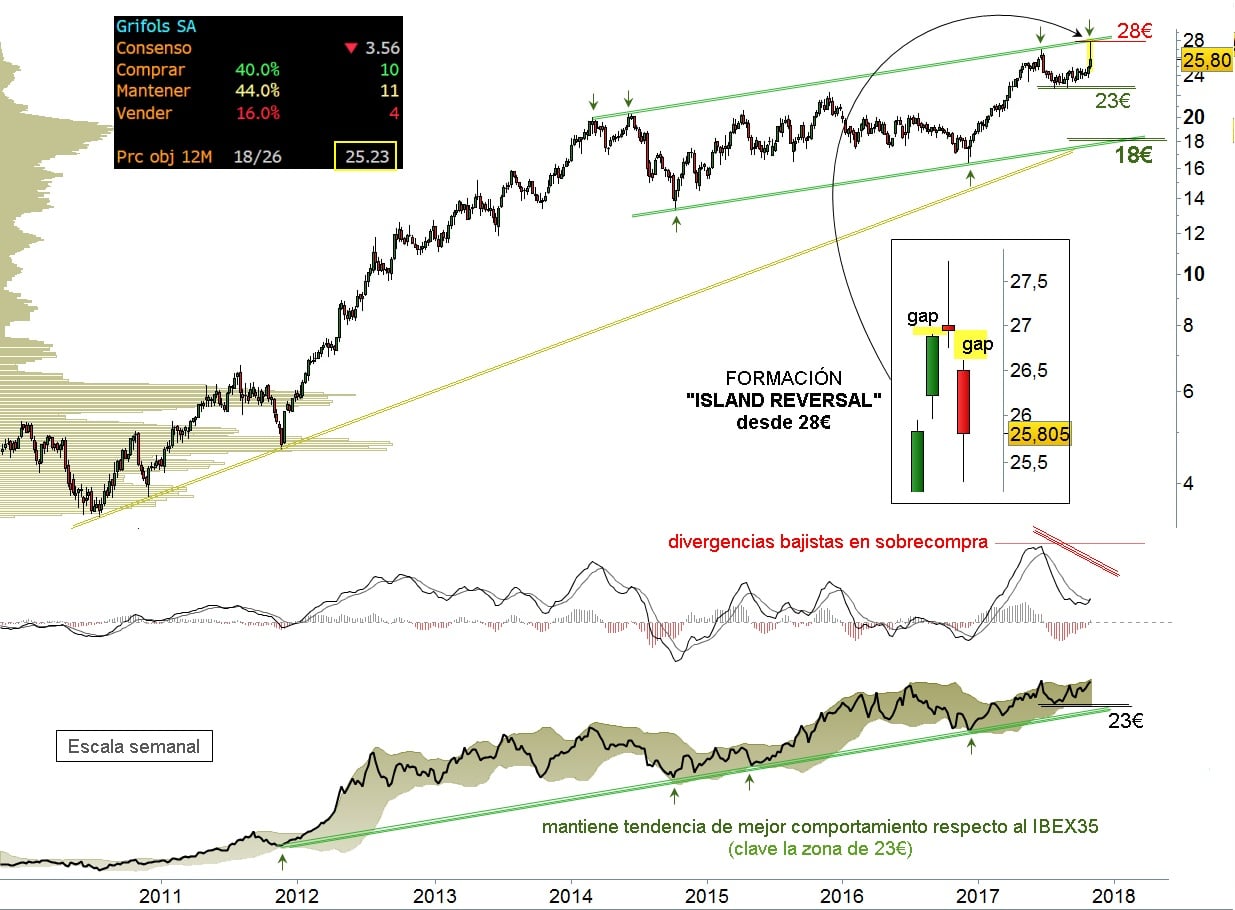 Las pautas dejadas esta semana por Grifols son típicamente bajistas, de zonas de techo temporal. Estaremos atentos al cierre de hoy ante la posibilidad de cerrar una pauta semanal potencialmente bajista.
