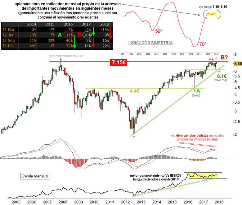 Los indicadores técnicos lentos presentan una situación de aplanamiento poco frecuente, que siempre precede importantes movimientos en el medio plazo. Es lógico entender que la salida del citado rango comprendido por los máximos históricos en 7,2 o la zona de soporte en 6,1 euros va a resultar determinante en los próximos meses.