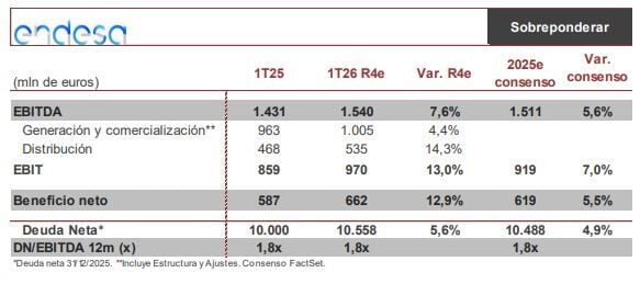 Renta 4 augura un incremento del 12,9% en el beneficio neto hasta alcanzar una cifra de 662 millones de euros. “Esperamos un primer trimestre recogiendo la mejora en la TRF (6,58% vs 5,58%) en el negocio de Distribución”, explica Pérez Llamazares. “En el negocio de Generación, no esperamos impacto relevante de la mayor producción hidráulica del periodo como consecuencia de los precios, si bien sí que es previsible que veamos en positivo la mayor producción eólica por mayor fator de carga y mayor capacidad frente al primer trimestre de 2025. En el caso de la nuclear, la parada temporal de dos reactores esperamos que sea compensado por unos mejores precios, mientras que, en el negocio de las Islas, la mayor TRF debería apoyar una ligera mejora. En Comercialización nuestras hipótesis siguen barajando un descenso en el número de clientes, si bien, el cierre del acuerdo con MásOrange debería compensar este descenso”.