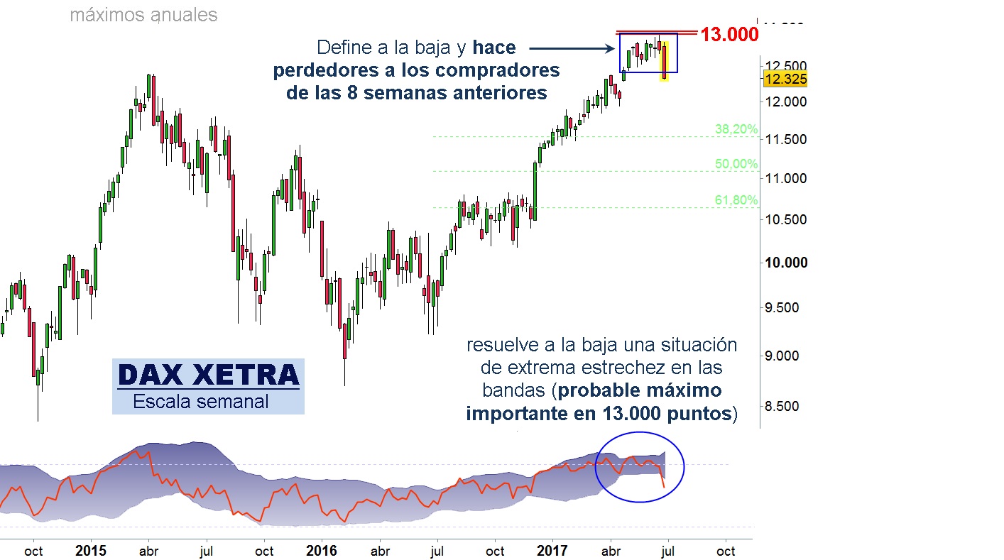 En este sentido aduciríamos varios motivos. La caída desde los máximos de hace algunas semanas provocó la pérdida de referencias importantes en varios valores, además de perder la normalidad correctiva que traían los índices desde los mínimos de las elecciones americanas. Abajo repetimos el gráfico de la semana pasada expuesto con el DAX XETRA. La pauta semanal dejada desde los 13.000 puntos englobó a la baja varias semanas anteriores, dejando bastante papel dispuesto a vender en rebotes: