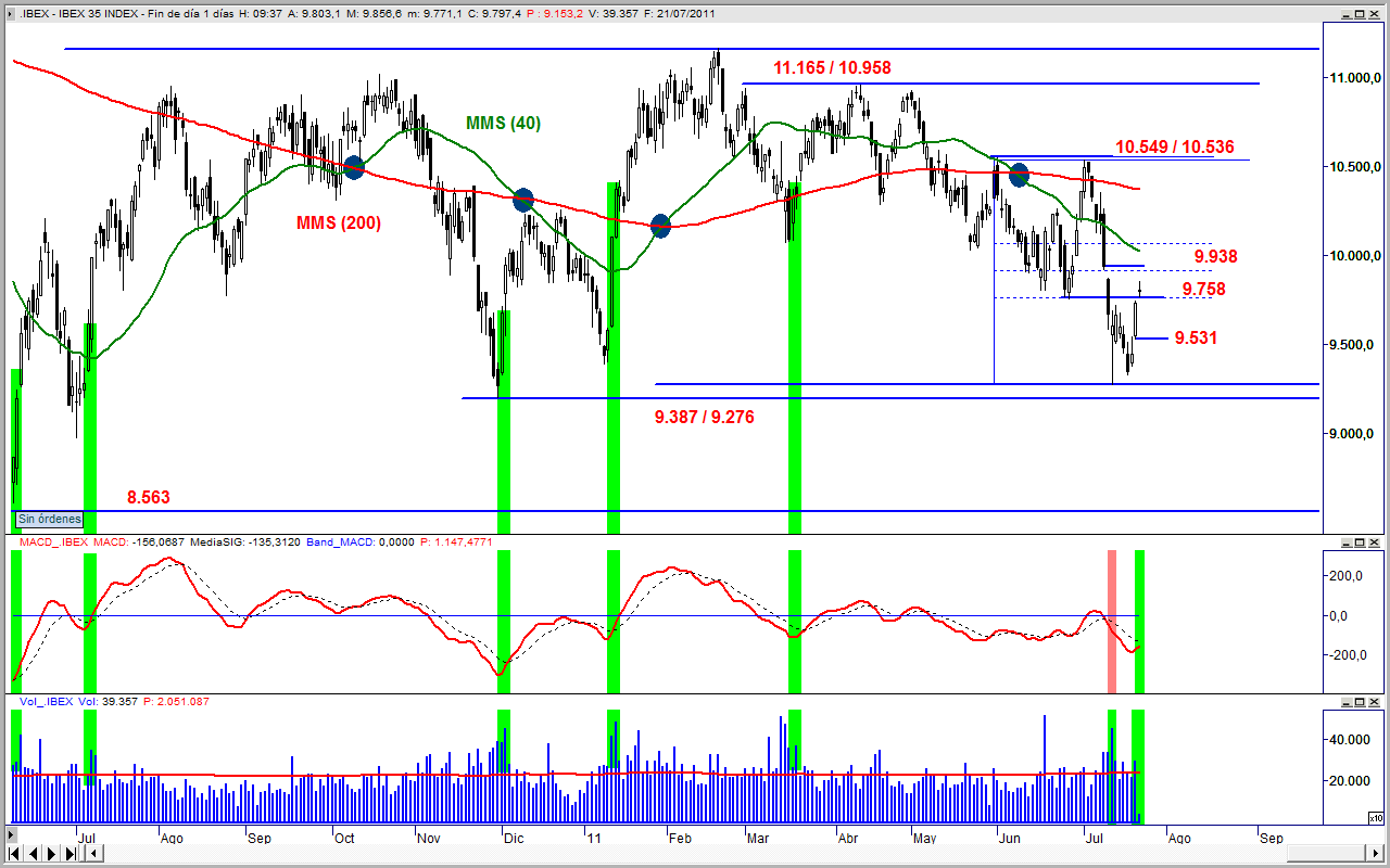 El movimiento alcista viene acompañado por un volumen creciente y favorece que los osciladores técnicos comiencen a girarse al alza. Circunstancias que, en ocasiones anteriores, han favorecido la formación de un suelo a medio plazo o han activado un rebote con mayor sostenibilidad. De esta forma consideramos el día de hoy clave para confiar en la apertura de largos. Una consolidación a cierre diario por encima de 9.758 acompañada por un volumen de negocio superior a la media son los requisitos que pedimos a estas alturas de sesión.