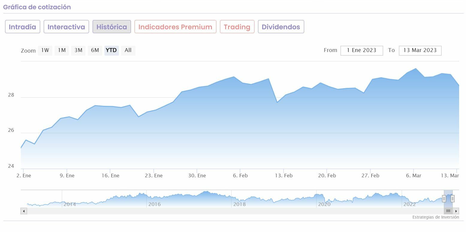 En su gráfica de cotización, vemos que el valor muestra caídas muy significativas, superiores al 5% en la sesión anterior, que alejan al valor de la cota de los 28 euros por acción, aunque se mantiene en el Top10, cerrando la lista en el Ibex, con ganancias anuales, todavía a doble dígito que superan el 11%.