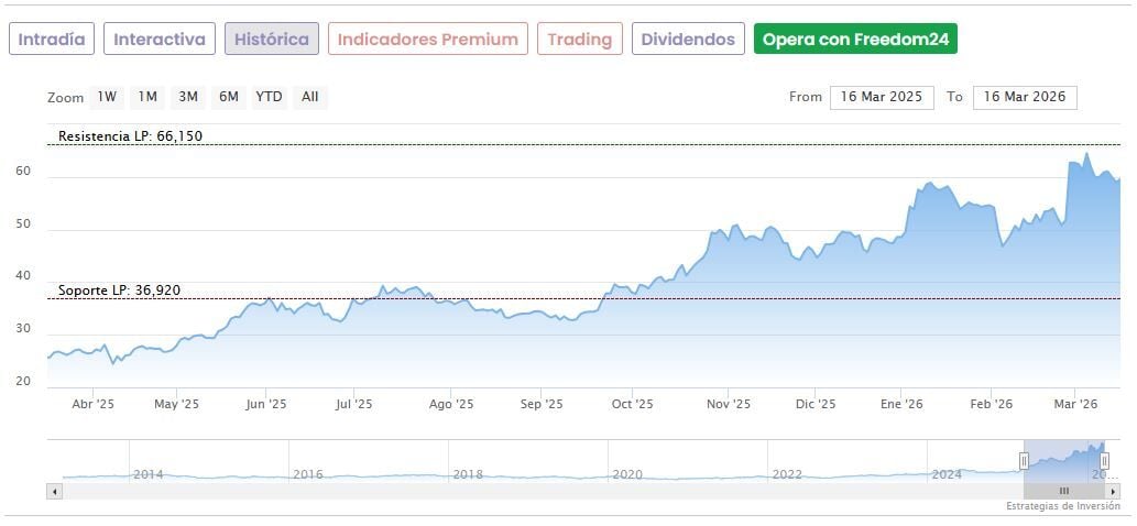 Desde el punto de vista del análisis técnico, Indra tiene por delante unas resistencias a medio y largo plazo en los 66,15 euros de sus máximos anuales. En cuanto a los soportes, el primer soporte a medio plazo está en los 45,34 euros, mientras que a largo plazo se sitúa en los 36,92 euros.