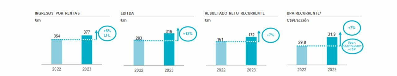 Durante el ejercicio 2023, la ocupación de la cartera de oficinas ha aumentado en 122 pb impulsado por mejoras de ocupación en todos los segmentos. El mayor avance anual se ha producido en Barcelona con una mejora de la ocupación de 390 pb en estos 12 meses.