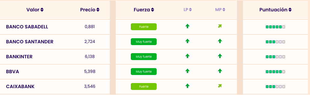 Si miramos los principales bancos españoles, vemos que según nuestros nuevos indicadores premium de fuerza y tendencia, están todos entre fuertes y muy fuertes en bolsa tanto a largo cómo a medio plazo. Además la puntuación por análisis fundamental es muy buena en BBVA y Banco Sabadell.