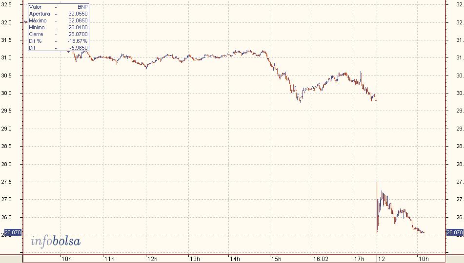 Cuando transcurre algo más de una hora desde la apertura de la Bolsa de París, las tres entidades llevan al Cac 40 a pérdidas superiores al 4,80%. Total es el valor que menos recortes está sufriendo y tengan en cuenta que hablamos de una caída del 3,43%. BNP Paribas encabeza la tabla con un recorte del 12,55% y coloca sus títulos al borde de perder los 26 euros; Crédit Agricole cede un 11,84%, en los 4,76%, mientras que la tercera en discordia, Société Générale, se desploma otro 1,35%, en los 15,48 euros.