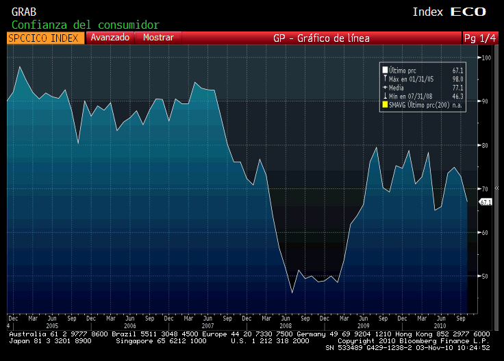 La confianza de los consumidores en España registró una fuerte caída en octubre, de 5,7 puntos, debido a que ha empeorado sobre todo su percepción de la situación económica actual, aunque también ha bajado en gran medida las expectativas para el futuro más próximo.