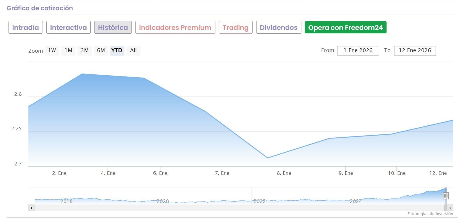 A pesar de ello, el precio marca ritmo en sus subidas, con lo que se coloca a apenas un 1,67% de su nuevo máximo histórico, el último marcado el pasado 5 enero, cuando cotizó en los 2,8660 euros por acción.