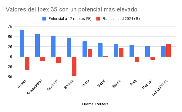 Según datos recopilados por Reuters, nada menos que 23 de los 35 componentes del IBEX 35 presentan un potencial de doble dígito a 12 meses vista. De ellos, 19 superan el 20% de recorrido alcista, en siete es superior al 30% y en tres, el 50%.