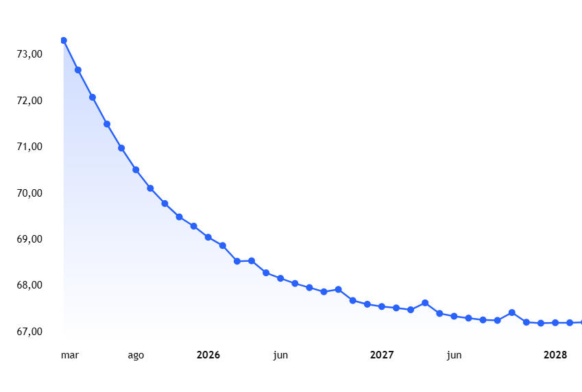 La curva sobre futuros Brent muestra claramente la caída esperada para el mercado del petróleo de corto y medio plazo, en función de los vencimientos de futuros. Actualmente está a 72,67 dólares el barril.
