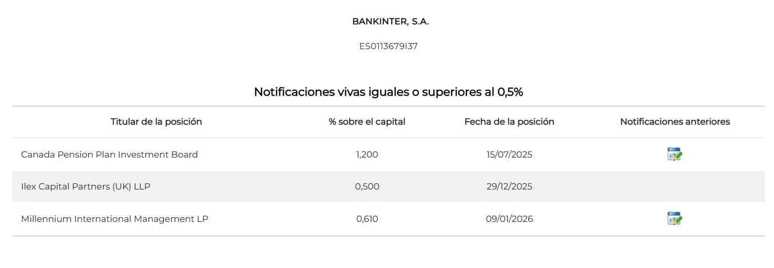 Entre los bancos, Bankinter, presenta tres bajistas en su accionariado y uno que elevaba, el pasado día 9 de enero, su presencia sobre sus acciones. Se trata de Millennium International Management LP, que pasa del 0,55% al 0,61%. En total, las posiciones cortas alcanzan sobre los títulos de la entidad un 2,31% con valor de mercado de 296 millones de euros.