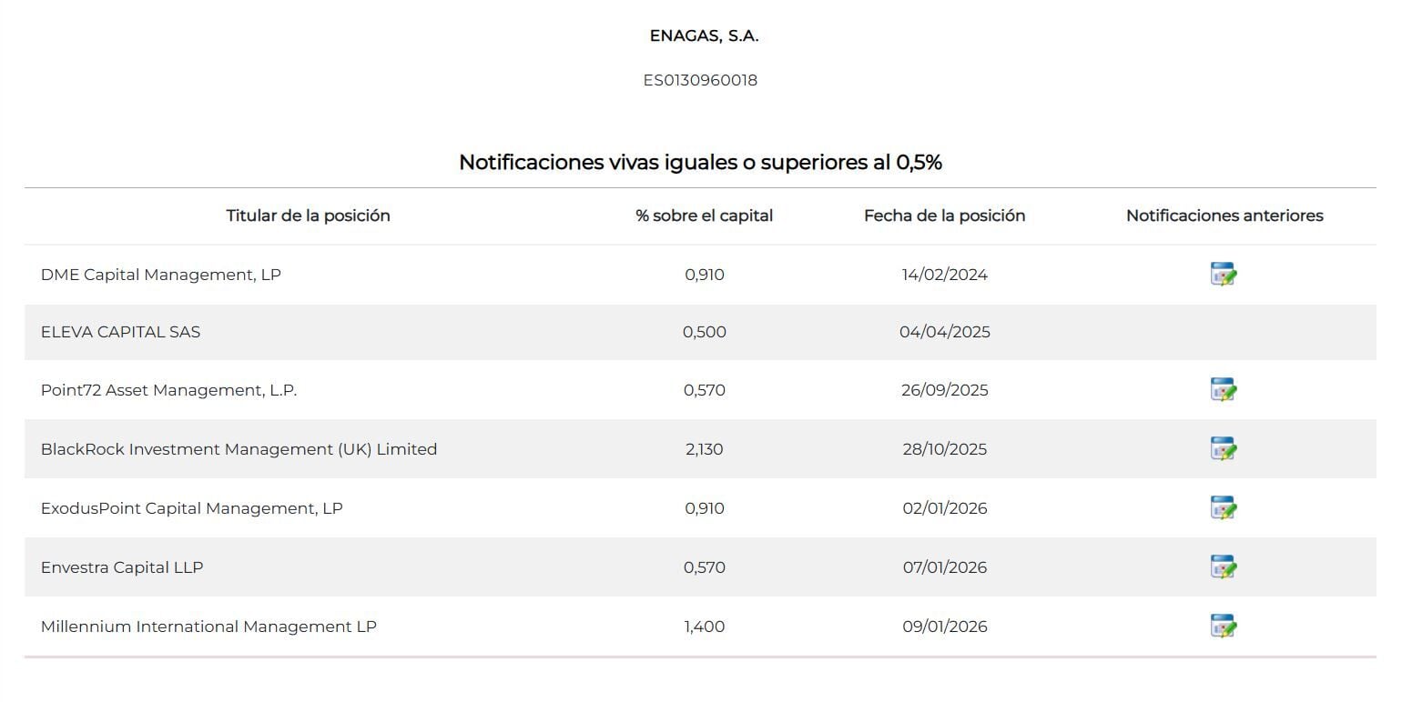 De cualquier forma, Enagás sigue siendo el valor que aglutina mayor cuantía de bajistas y mayor porcentaje de posiciones cortas de todo el Ibex 35. Roza el 7% para los también 7 hedge funds que se posicionan a la baja sobre el valor. En concreto, 256 millones de euros de bajistas.