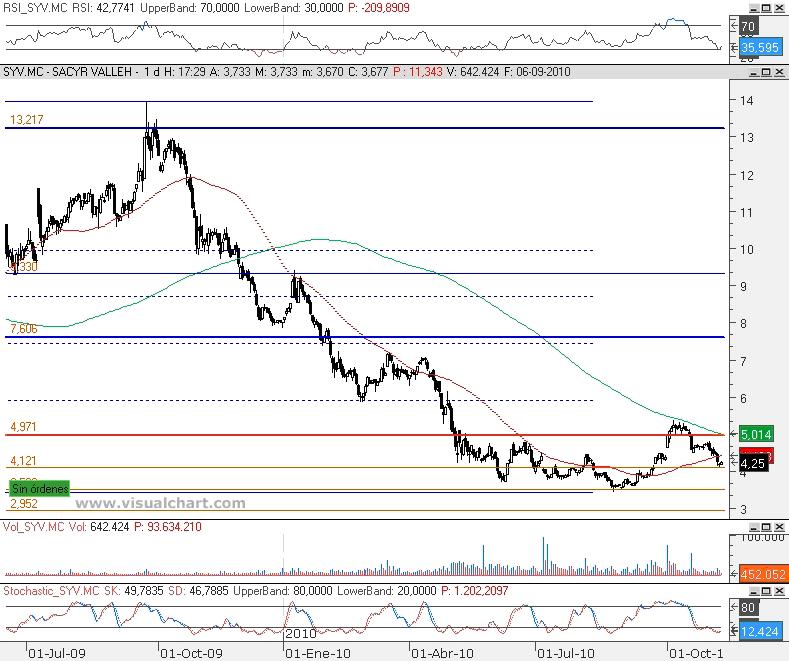 Sacyr se dejó el 90,37% de su valoración bursátil en el fuerte deterioro que experimentó desde los máximos de 2.006 hasta marzo de 2.009. Desde allí, se inició una recuperación que sin ser considerable, permitía alejar la debilidad del escenario. Sin embargo, lo peor no había pasado; los mínimos de 2.009 se rompían a la baja en agosto de 2.010 y el deterioro continuaba. Ahora, el valor cotiza con un deterioro considerable, por debajo de aquellos mínimos. A priori es imposible saber si se está formando un suelo o si por el contrario el deterioro aún no ha concluido. Es por ello que nos abstenemos de tomar posiciones en el valor hasta que no tengan lugar figuras de vuelta claras y el binomio rentabilidad riesgo sea más atractivo. Así, para un perfil bastante agresivo, solo por encima de los 7,60 nos parecería atractivo el valor.