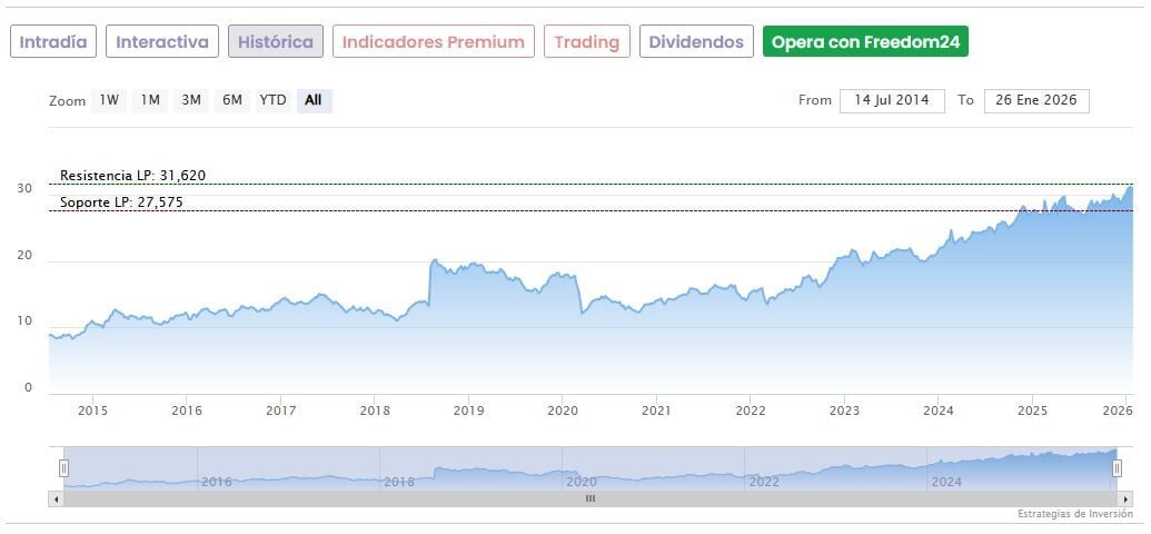 Los títulos acumulan una subida del 8,5% en los últimos 12 meses, mientras que desde sus mínimos de las últimas 52 semanas, fijados en 26,16 euros desde abril del año pasado, el rebote es de un 18,2%.
