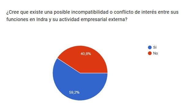 Aun así, la mayoría de los lectores creen que hay incompabilidad entre sus funciones en Indra y su actividad empresarial en Escribano, EM&E Group. El 59,2% de los encuestados cree que hay conflicto de intereses frente al 40,8% que cree que no los hay aunque , al ser consultados por su nivel de satisfacción con la gestión de Escribano al frente de Indra, un abrumador 75% se declara “satisfecho” mientras sólo el 5,8% se muestra insatisfecho.