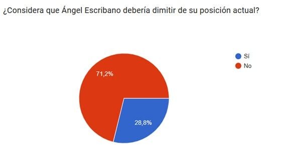 Los datos son contundentes. A la pregunta de si Ángel Escribano debería dimitir de su posición actual, una amplia mayoría del 71,2% se muestra a favor de su permanencia al frente del Indra frente a un 28,8% que aboga por su salida de la compañía.