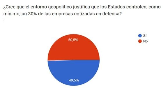A pesar de los movimientos geopolíticos, por la que los Estados están incrementando su gasto en defensa y adoptando políticas industriales más intervencionistas, incluyendo la toma de participaciones, inversiones directas y prefinanciación en compañías industriales del sector defensa, algo más de la mitad (50,5%) de los encuestados creen que los estados no deberían controlar un 30% de las empresas cotizadas en defensa.