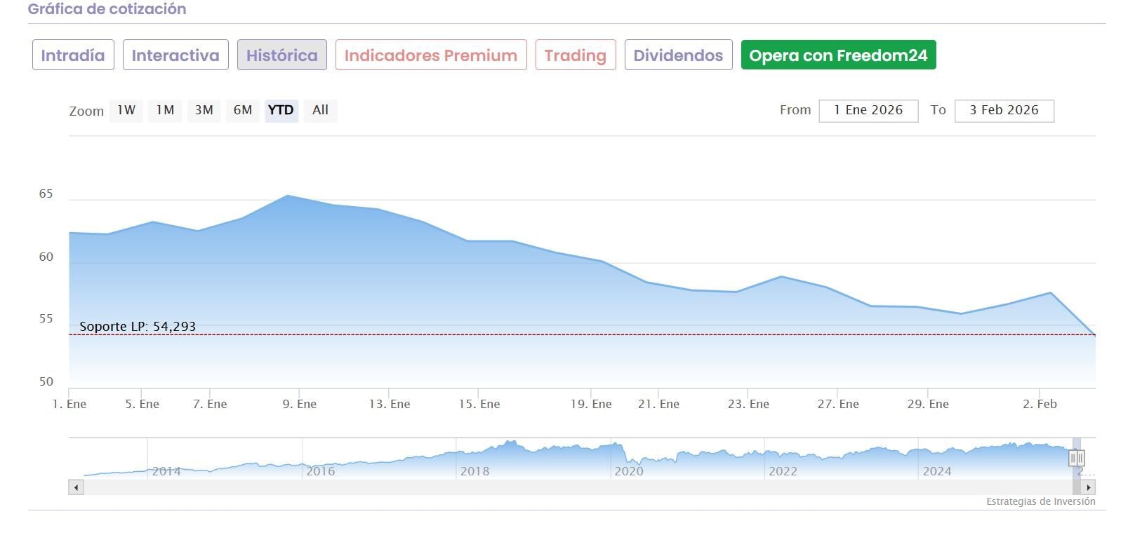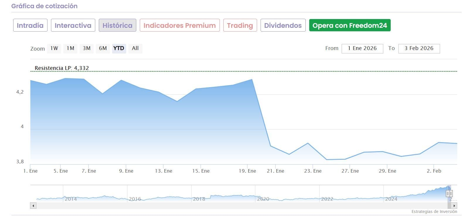 Es el valor que peor se ha comportado en enero. En especial, por el efecto pernicioso de una recomendación de UBS que hundió al valor el día 20 del pasado mes. El banco suizo apostaba por vender, mientras iniciaba cobertura sobre el valor, y su cotización se colocó en un nivel de precio sobre el objetivo que marcaba la entidad al cierre de la sesión, ante un potencial negativo, entonces de casi el 10% sobre el valor. Y sus caídas alcanzaron su mayor nivel, rozando el 9%, desde los tiempos de la pandemia.