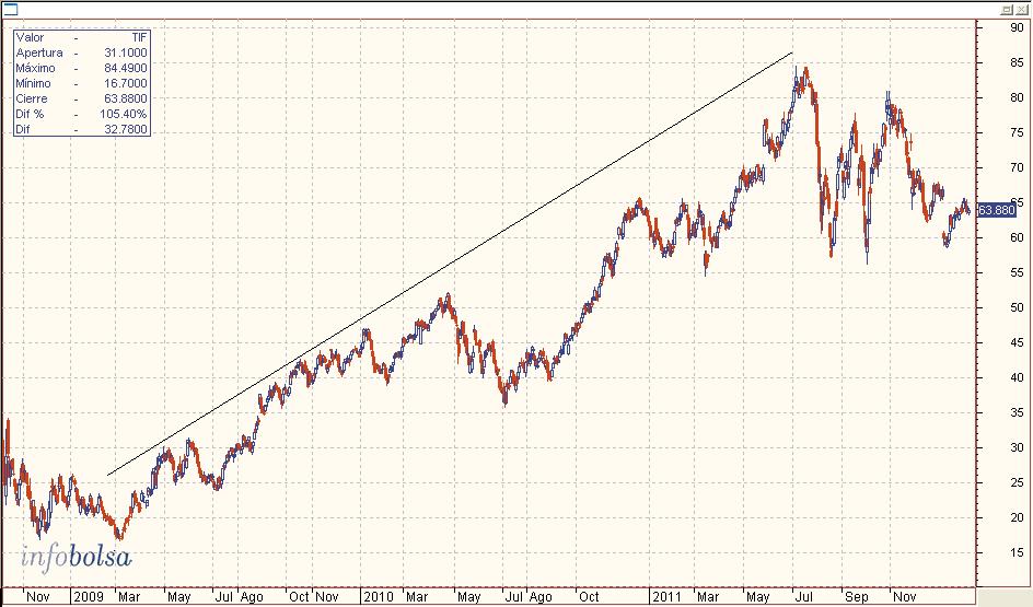 - Estrategia con TIFFANY´S: “Desde entonces el valor se encuentra inmerso en un proceso de consolidación que le está sirviendo para descargar la fuerte sobrecompra acumulada en los últimos dos años. Parece que ese proceso de consolidación podría estar llegando a su fin y la clave pasa por un nivel: los 57,50$ ( nivel de soporte importante, ya que además de coincidir con la tendencial que rige el movimiento alcista en gráfico semanal, es el 61,8% de toda la subida citada anteriormente entre marzo de 2009 y julio de 2011).” Desde M&M Capital Markets, “consideramos que hay que ser bastante cautos a la hora de tomar posiciones en el valor, y en caso de hacerlo, situar siempre un stop loss en cierres por debajo de los 57,50 dólares que minimicen al máximo el riesgo que asumimos.”