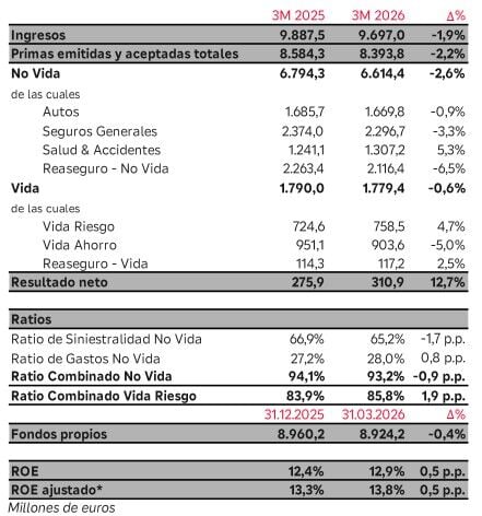 El ratio combinado de No Vida mejora hasta el 93,2% (-0 ,9 p.p.), mientras que el ROE avanza hasta el 12,9% (13,8% sin extraordinarios) , y los fondos propios se mantienen por encima de los 8.900 millones. El ratio de solvencia se sitúa en un 205,3% a cierre de 2025, en la parte alta del rango objetivo del Grupo.