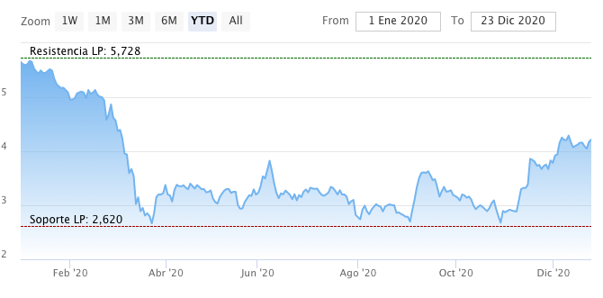 En su cotización vemos como se refleja un avance sustancial para el valor desde que dejara el Ibex, con un repunte que alcanza el 32% y más si cabe, desde el 9 noviembre a cuenta del rally de las vacunas con avances del 46%. Mantiene por tanto la tendencia positiva aunque siguen sus pérdidas en el cómputo anual a punto de cerrarlo, alcanzan el 25,5%. Y mantiene desde el 18 de septiembre una posición bajista en su capital del 0,61% por parte de Adelphi Capital.