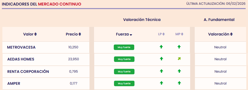 Si miramos a los valores con más fuerza del Mercado Continuo, según nuestros indicadores premium, más allá de los 23 valores del selectivo, hay otros 38 valores del Continuo, como Metrovacesa, Aedas Homes, Renta Corporación o Amper, entre otros, que cuentan con mucha fuerza y una tendencia alcista (Conoce el resto de valores muy fuertes del Continuo).