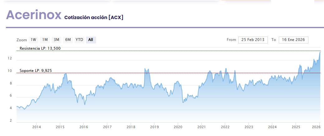 Después de un 2025 de fuegos artificiales —con una revalorización del 41,8%—, Acerinox se toma el inicio de año con serenidad. El título cae cerca de un 1% y cotiza en 12,8 euros. Barclays eleva su precio objetivo hasta 14 euros desde los 13 previos, lo que implica un potencial del 9,6%. No es una promesa de vértigo, pero sí una invitación a la paciencia: crecimiento más medido, expectativas ajustadas y un valor que aún conserva margen para pulir.