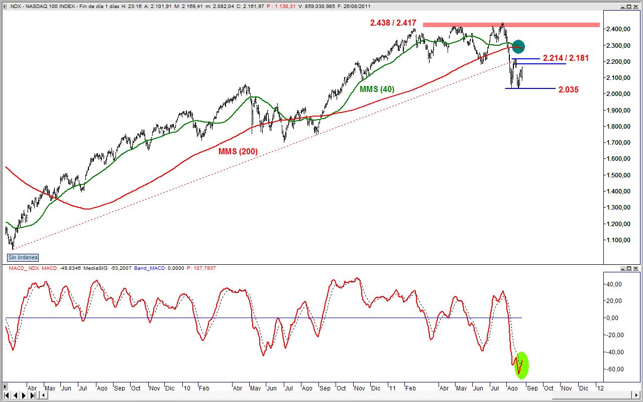 El índice encuentra apoyo a la altura de 2.035 y vuelve a rebotar hasta aproximarse a la zona de resistencias comprendida entre el máximo significativo situado en 2.214 y la banda superior del hueco de escape a la baja del 18 de AGO11 que se encuentra en 2.218.