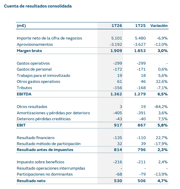 La cifra de negocios alcanzó los 5.101 millones de euros, lo que representa una caída del 6,9% interanual, afectada por unos menores precios del gas y la electricidad durante buena parte del trimestre.