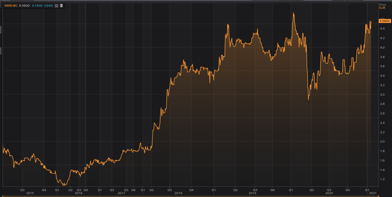 Rota la barrera de los 4,5 euros, las acciones de NBI continúan la senda de recuperación iniciada en marzo de 2020 y cada vez están más cerca de los 4,74 euros, su máximo histórico a cierre. Lo tiene todo a su favor para ello: una posición inalterable en los objetivos a largo plazo en su Plan 50/22, varias operaciones inorgánicas realizadas en 2020 que contribuirán a su crecimiento orgánico y una vacuna que favorecerá que la recuperación paulatina de la demanda.