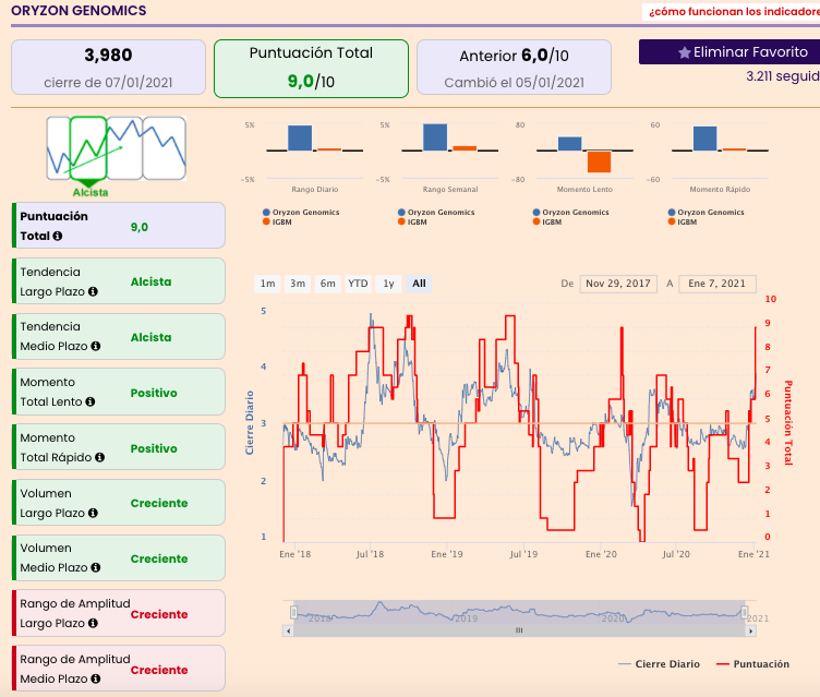 Buenas perspectivas por fundamental y excelentes por técnico. Según los indicadores técnicos de Estrategias de inversión, Oryzon cuenta con una técnica de 9 sobre 10 puntos posibles y se encuentra en fase alcista, tendencia que mantiene tanto en el largo como el medio plazo. El momento es positivo y el volumen es creciente, tanto a medio como a largo plazo; sin embargo, también crece la volatilidad.