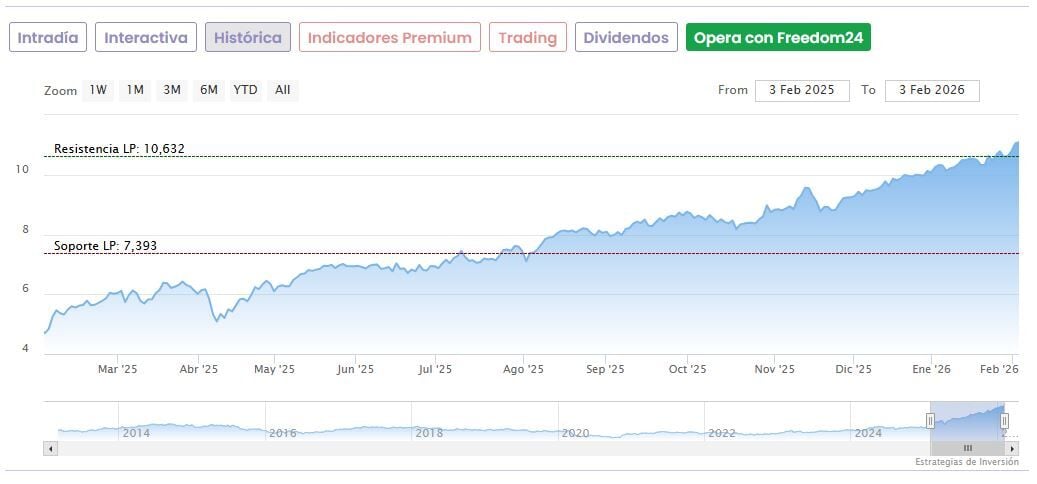 A pesar de las caídas de hoy, las acciones de Banco Santander acumulan una subida de un 130,8% desde sus mínimos de las últimas 52 semanas, fijados en 4,645 euros desde abril del año pasado. Ayer 3 de febrero los títulos llegaron a unos máximos históricos de 11,36 euros, si bien han corregido un 5,6% desde esta cota.