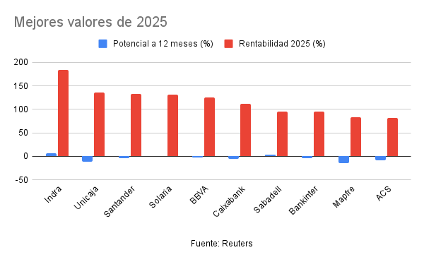 Si se pone el foco en los mejores valores del IBEX 35 en 2025, los analistas apuestan por la prudencia, si bien todavía hay alguna oportunidad. Indra, por ejemplo, se disparó más de un 180% el año pasado al calor de los planes de los Gobiernos europeos (entre ellos el español) de impulsar el gasto en defensa, pero todavía presenta un potencial moderado de algo más del 6% hasta un precio objetivo de 51,36 euros que supondría nuevos máximos históricos.