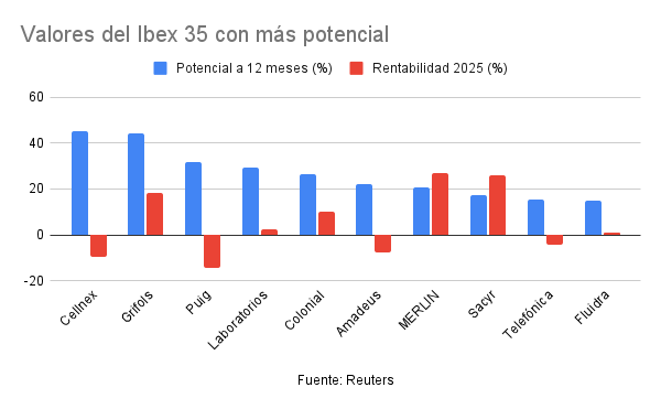 Por ello, los inversores tendrán que escudriñar con meticulosidad las oportunidades que sigue ofreciendo el Ibex 35 para este año que comienza; y no son pocas, a juicio de los analistas fundamentales. A día de hoy, 23 de los 35 componentes del IBEX 35 presentan un potencial alcista a 12 meses vista, según datos recopilados por Reuters. En 13 de ellos el potencial es de doble dígito, con 7 teniendo por delante una subida de más de un 20% y 2 superando incluso el 40%.