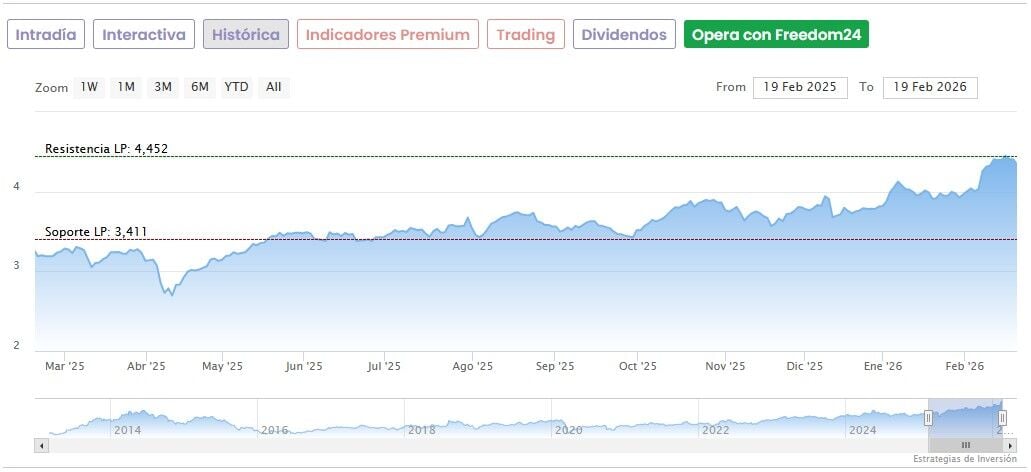 Las acciones de Sacyr han comenzado el año con muy buen tono, acumulando una subida de más de un 15% en el acumulado de 2026. Llegaron a tocar un máximo de 4,452 euros la semana pasada, antes de corregir ligeramente, y acumulan una subida de más de un 76,5% desde los mínimos de abril del año pasado.