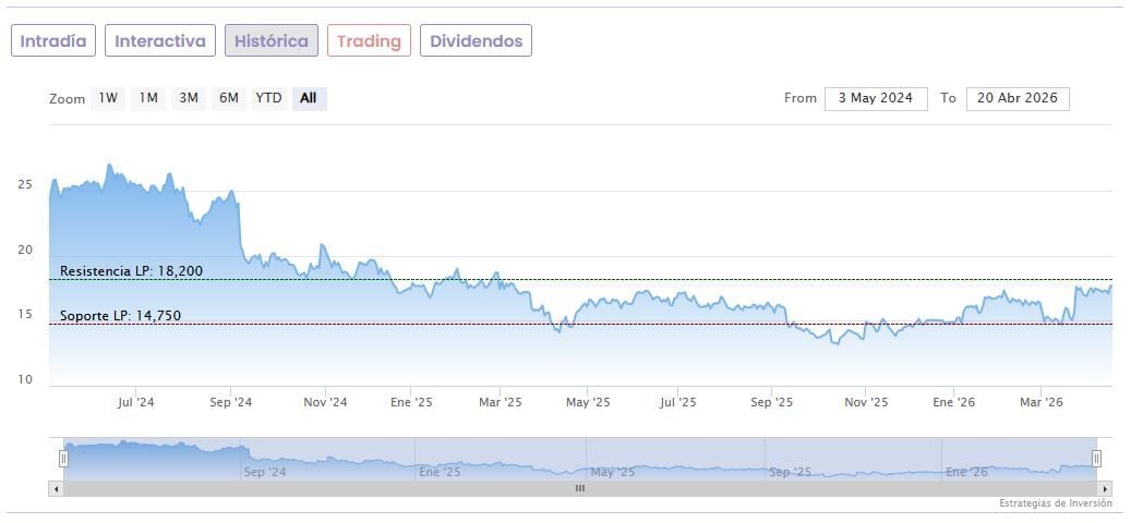 No obstante, las acciones se encuentran en máximos anuales, con un rebote además de un 39,3% desde que el 14 de octubre del año pasado marcó mínimos en 13,11 euros. En lo que va de 2026, el avance acumulado es de un 22,8%.