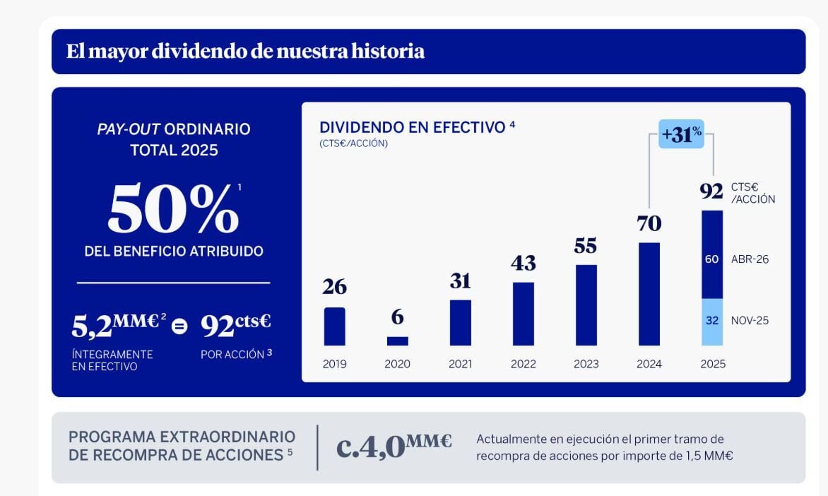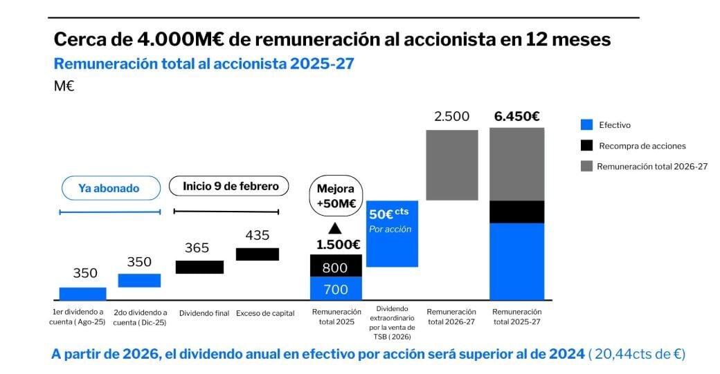 Por ejemplo, en septiembre pasado implementaba la sexta mejora del dividendo desde que se lanzara la oferta, y la final, vino después de su fracaso: 4.000 millones de euros en 12 meses. Se desglosan en los 700 millones ya distribuidos a cuenta de los resultados de 2025 y 800 millones en recompras que comenzaron el 9 de este pasado mes de febrero.