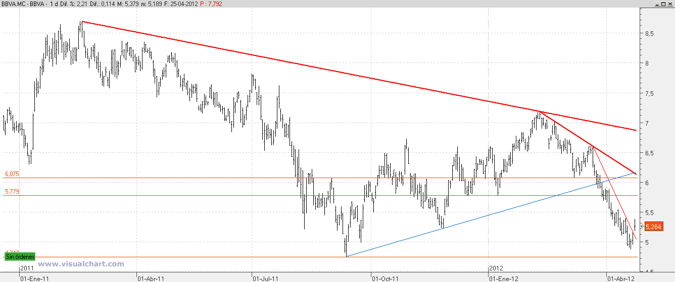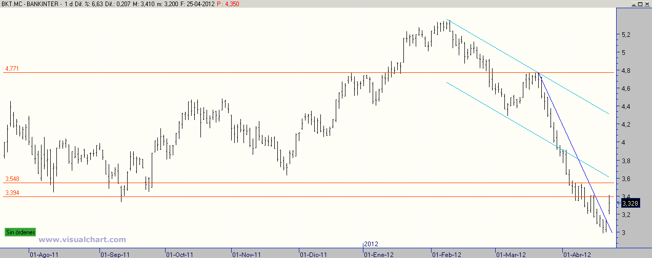 - BBVA: “Sigue directrices bajistas desde comienzos de 2011. Ahora vemos como tras la fuerte caída que ha sufrido, se encuentra rebotando, y ha dejado atrás la directriz bajista más ceñida. Podría llevarnos hacia los resistencias situadas en los 5.77 euros y en los 6,075 euros. Por abajo controlaremos el soporte de los 4,74 euros.”