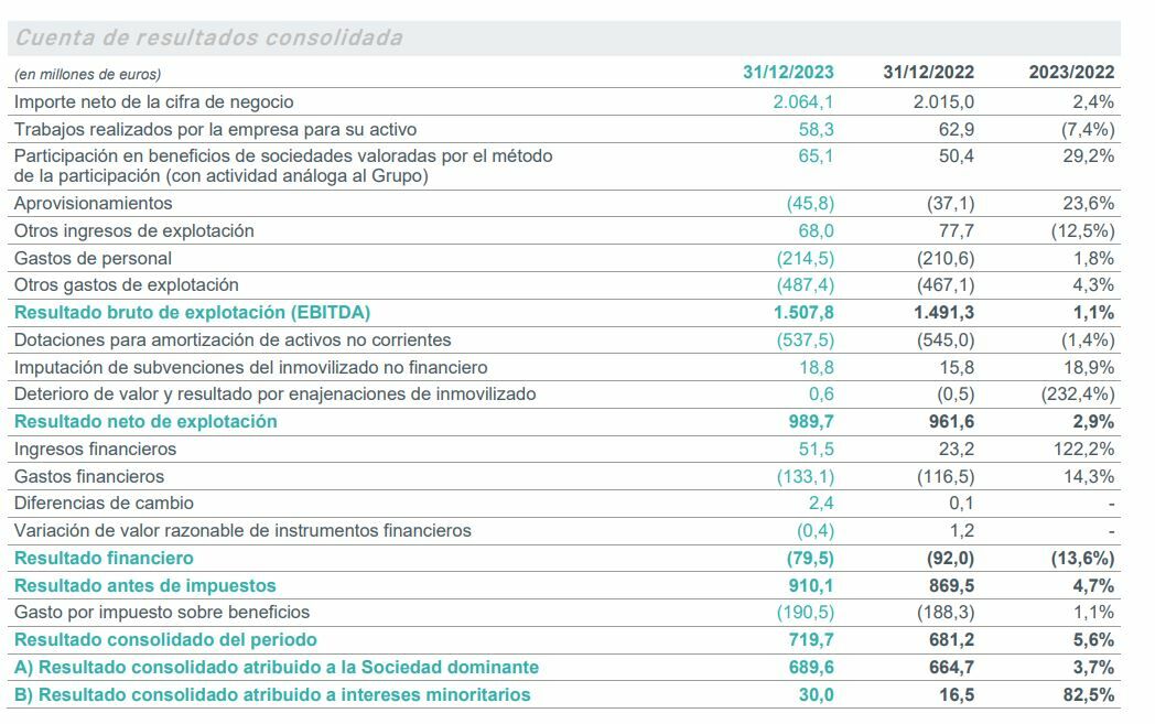 De esta forma, el EBIT alcanza los 989 millones de euros, un 2,9% por encima del registrado en 2022. Un incremento que, según la compañía, se debe al aumento del EBITDA y a la caída de las amortizaciones.
