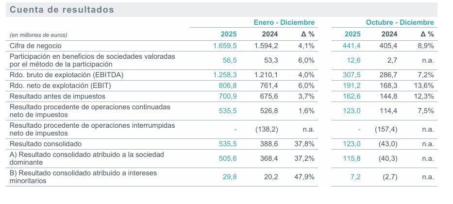 La cifra de negocio del grupo alcanzó los 1.659,5 millones de euros, un 4,1% más que en 2024, mientras que el EBITDA se situó en 1.258,3 millones, con un crecimiento del 4,0%. El beneficio neto atribuido a la sociedad dominante ascendió a 505,6 millones de euros, lo que supone un incremento del 37,2%, apoyado también en la ausencia de operaciones interrumpidas frente al ejercicio anterior.