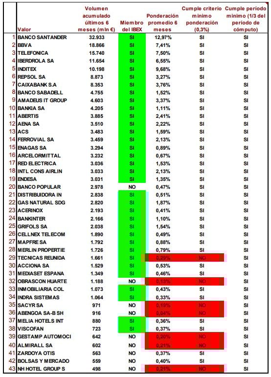 Según los números de Renta 4, a pesar de que en base al volumen negociado en el periodo de cómputo, OHL, Sacyr y Abengoa superarían a Meliá Hoteles y a Viscofan, actualmente miembros del Ibex 35, no deberían producirse cambios en la composición del índice.
