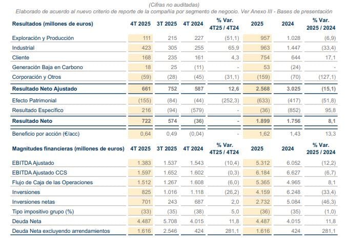 El resultado bruto de explotación (Ebitda) ajustado de la petrolera, que publica estos resultados con nuevo modelo de reporting por segmentos de negocio, se situó en los 5.312 millones de euros en 2025, con un descenso del 12,2%.