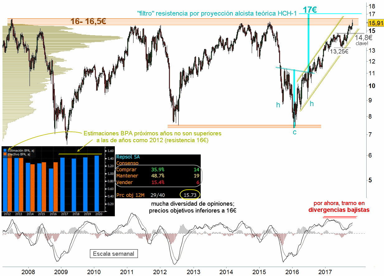 Repsolse sitúa en niveles técnicos de resistencia muy importantes. La zona de 16,5 euros constituye los máximos históricos del valor (corregido con los dividendos). Por otro lado subyace una proyección alcista teórica en 17 euros. En base a la cercanía de la proyección con la zona de resistencia, se conforma una zona clave de obstáculos.