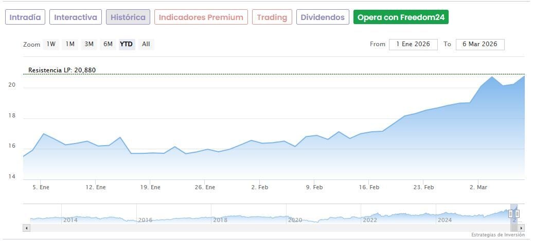 Las acciones llegaron a marcar un máximo anual en 20,88 euros el pasado 5 de marzo y suben ya un 30,4% en lo que va de 2026. Desde los mínimos de abril del año pasado, la subida es de un 120,6%.