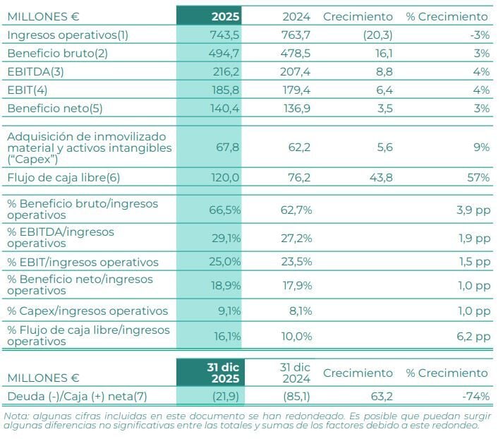 El EBITDAaumentó un 4% hasta alcanzar los 216,2 millones de euros en 2025, reflejando un incremento en el margen EBITDA de 1,9 puntos porcentuales hasta alcanzar el 29,1% en 2025 desde el 27,2% registrado en 2024.