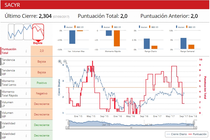 Los indicadores técnicos dan una puntuación a Sacyr de 2 sobre 10, al encontrarse en fase bajista.