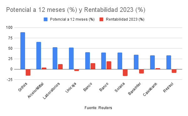 También con un potencial más que considerable, que supera el 65%, emerge ArcelorMittal, al que los analistas dan un precio objetivo de 42,05 euros. El valor, que sube algo más de un 4% en 2023, debería verse favorecido por las mejores perspectivas de la demanda de acero mundial tras la reapertura de China.
