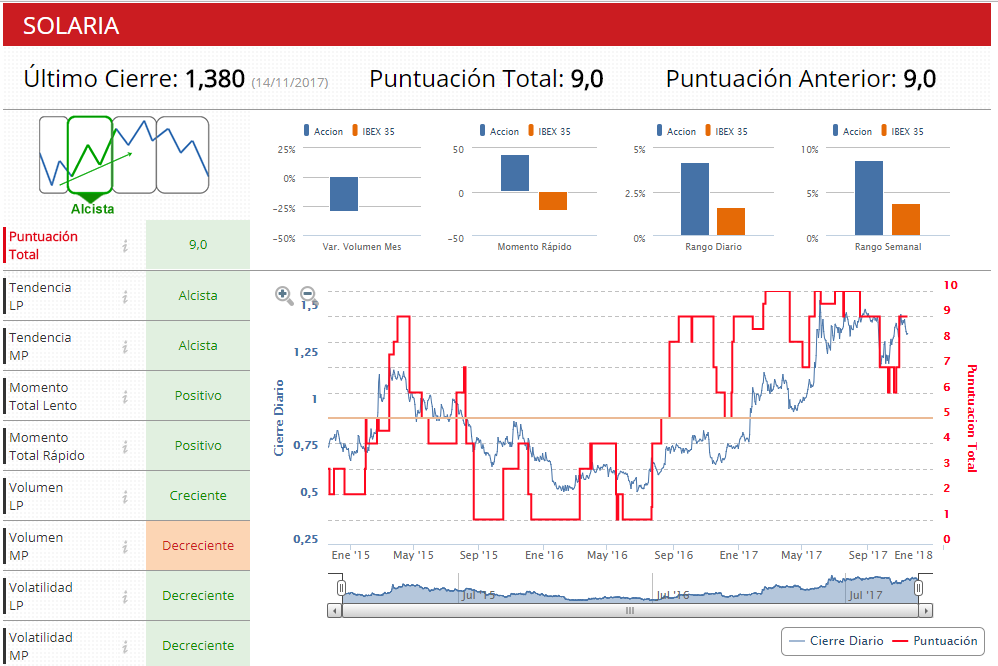 La buena marcha de la compañía se ve reflejada en los indicadores técnicos de Estrategias de Inversión, que dan a Solaria una puntuación de 9 sobre 10. La tendencia es alcista tanto en el medio como en el largo plazo y una volatilidad decreciente en ambos periodos.